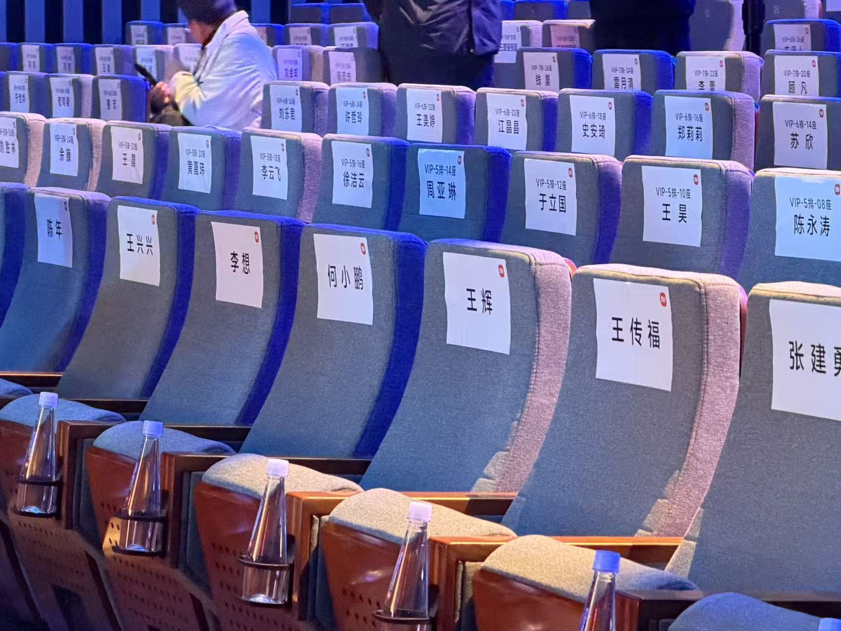 从现场画面来看,发布会前排嘉宾席的专属名牌已被依次摆放就位。除了备受瞩目的造车新势力与传统头部车企掌舵人紧密相邻外,现场名牌还显示,北汽集团董事长张建勇、凡客诚品创始人陈年以及宇树科技创始人王兴兴等人也将同排就座。