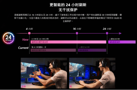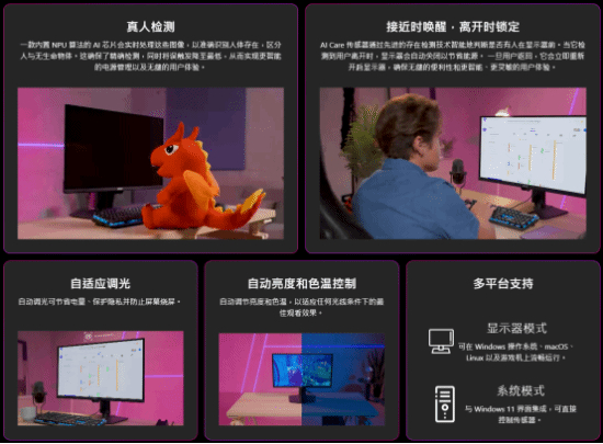 在防烧屏与耐用性上,微星祭出了软硬结合的护城河。面板硬度从2H提升至3H,抗刮擦能力倍增。核心软件层面,由NPU AI芯片驱动的OLED Care 3.0智能感测技术实现了质的飞跃:传感器能精准识别人与无生命物体的区别,当用户离开工位时自动触发像素刷新或电源管理,所有数据均在本地处理,既保护了隐私,又从根本上延长了面板寿命。