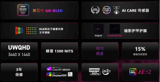 微星MPG 341CQR QD-OLED X36流光显示器(以下简称X36流光)作为首批搭载该面板的力作,不仅是刷新率飙升至360Hz的性能怪兽,更通过RGB条纹子像素布局、NPU驱动的AI感测技术以及独家均匀辉度功能,彻底模糊了旗舰电竞装备与专业创作工具之间的界限。这款34英寸21:9超宽曲面显示器已在京东等平台开售,首发定价6999元,并提供了包含三年烧屏保及免费上门更换在内的售后政策。