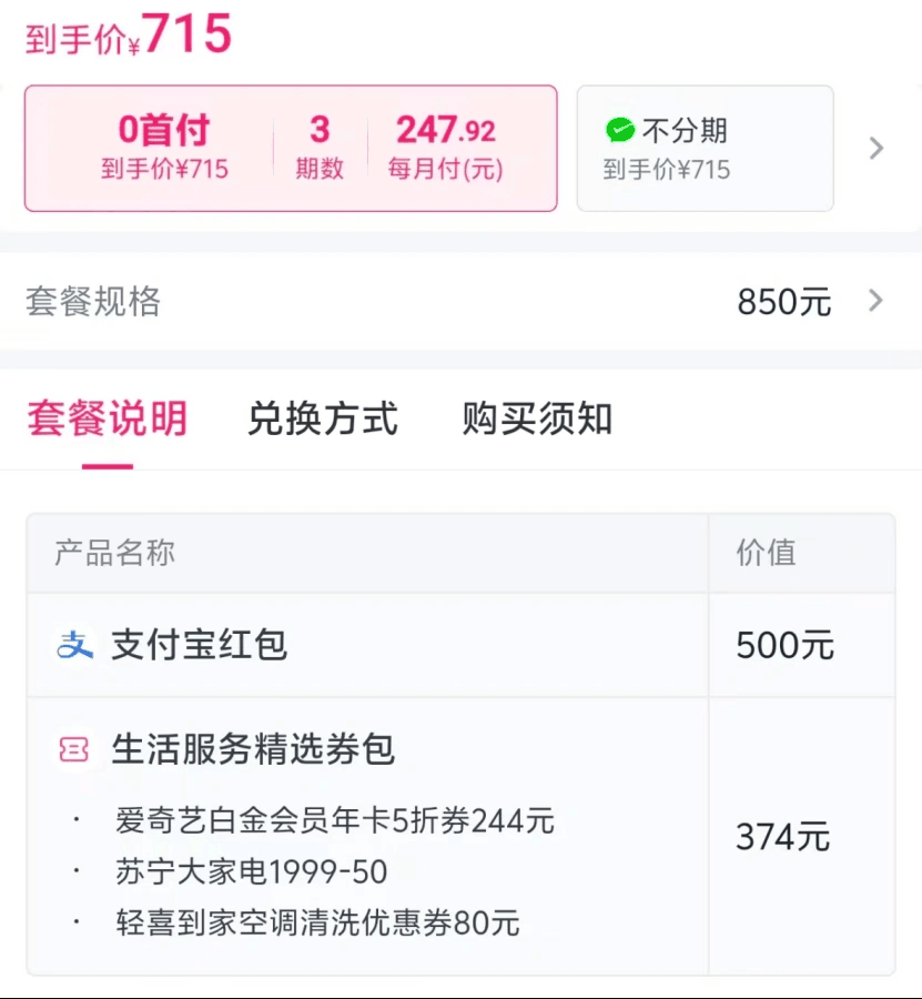 这并非个例。另一款“支付宝红包”套餐,到手价715元,而实际到账的红包仅为500元。在黑猫投诉平台上,有消费者反映购买了9000元的红包套餐,实际到手的金额只有6800元,其余全是“用不上”的权益券,分3期总还款额高达9800多元。
