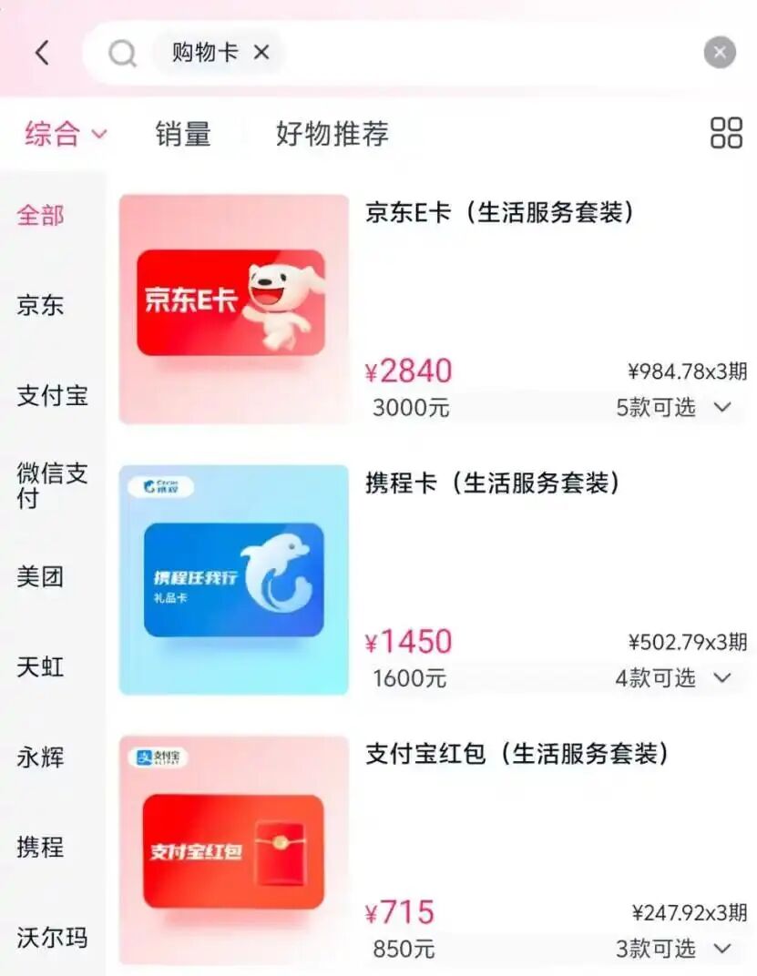 这种定价逻辑的诡异之处在于,消费者实际上是以84折的“溢价”购买了一张标准购物卡。如果选择分期付款,以3期为例,消费者0首付下单后总计需还款2954.91元,对应的年化利率高达24% 。