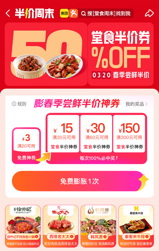 来源标题:最高立减150元美团“堂食周末”发放4亿张半价券点燃春日“食”力