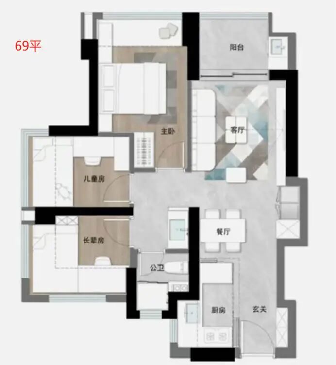 项目最大的亮点,69㎡做了三房。