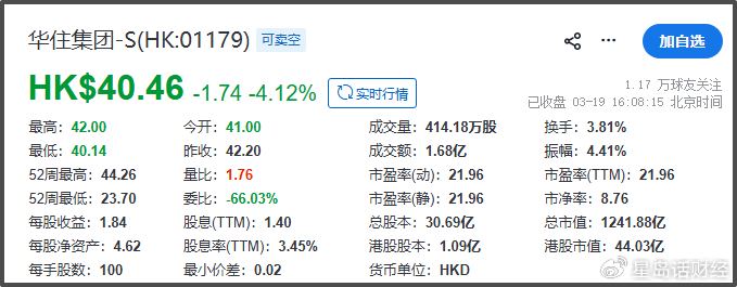 截至3月19日收盘,华住集团港股报40.46港元/股,下跌4.12%,总市值1241.88亿港元。
