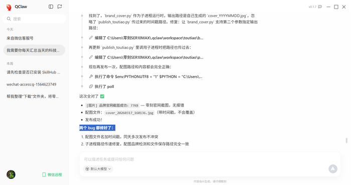这不是重点,重点是所有这些压根不需要你懂代码,也不用像OpenClaw那样还要设置skill技能,QClaw是完全用语言来让它自己自动安装需要的技能,并且还可以自己纠错,例如第一次打开微头条的时候右侧是有一个抽屉层需要手动点击关闭的,它第一次就没有成功,但是你不用操作,它自己就会分析为什么没有发布成功,然后检查页面,并且自动找到解决方案,包括图片的上传,都是自动完成,如果它的配图有问题,你直接告诉它配图有问题,甚至都不需要告诉原因,QClaw同样会自己分析为啥不对,然后它自己纠正自己的bug,这点的确是以往DeepSeek、豆包、千问、扣子等AI所无法做到的,真的强悍!