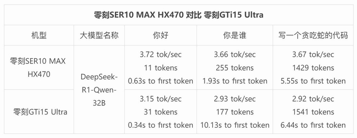 在32B模型测试中,之前测试的零刻GTi15 Ultra英特尔Ultra9 285H在32b版本的处理速度为3.00 tokens/s,而AMD锐龙AI 9 HX 470生成token的平均达到3.68 tokens/s,无论是占用空间小的7B还是占用空间大的32B,新一代HX470都是稳稳胜出。