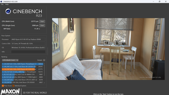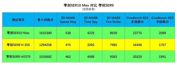 在BIOS里可以开启到65瓦性能模式,直接上跑分,均衡模式下鲁大师155万分,3DMARK跑分Speed Way 538,Time Spy 4225,Fire Strike 8929,PCMARK10综合得分7557,性能模式下高达161万分,CineBench R23单核跑分2088,多核跑分23775,通过对比上一代零刻SER9 Pro和SER9 Max,可以看出提升还是很明显的。