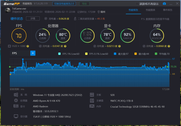 游戏帧率性能测试,在1080P低画质下,《绝地求生》平均帧率70FPS,《CS2》平均帧率101FPS,《英雄联盟》平均帧率145FPS,那如果不在意画质的情况下,这些中大型游戏乃至3A游戏还是能够流畅运行的,当然,我想也没人会用迷你主机开4K游戏。