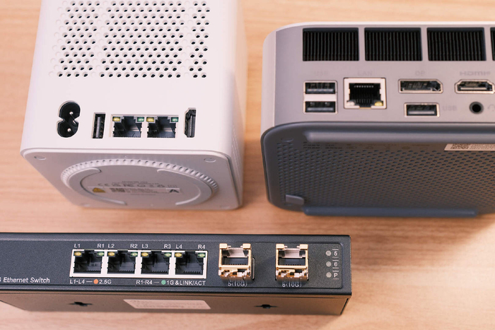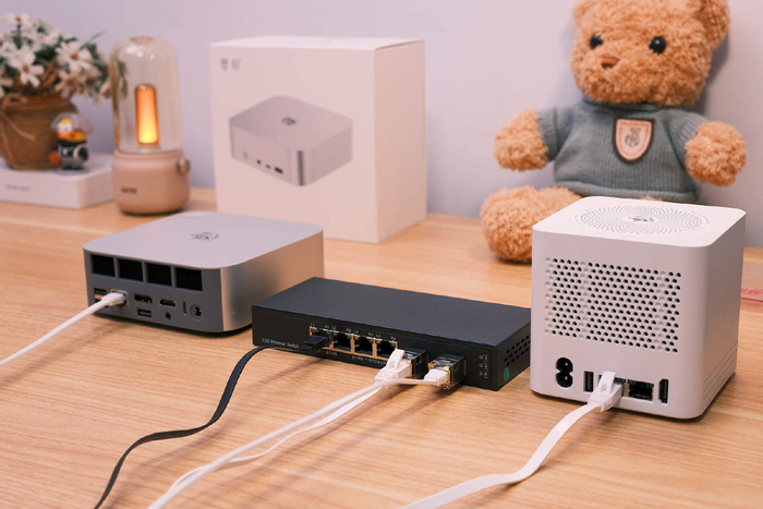 那有了万兆路由器或者是万兆交换机的话,配合你的NAS设备就可以实现高速率传输了,比如最近很火的零刻飞牛联名款ME Pro,又或者是你自己购买的其它支持5GbE传输的NAS设备都可以。