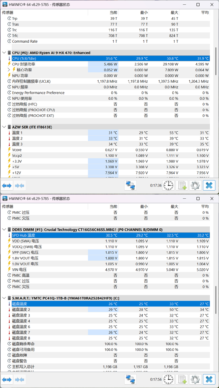 那一旦退出游戏或者关闭压力测试之后,零刻SER10Max迷你主机的日常办公CPU温度非常低,最高50.8℃,平均温度31.9℃,内存条和硬盘更是得益于MSC2.0散热系统,全程温度都没有超过33℃,散热非常优秀。
