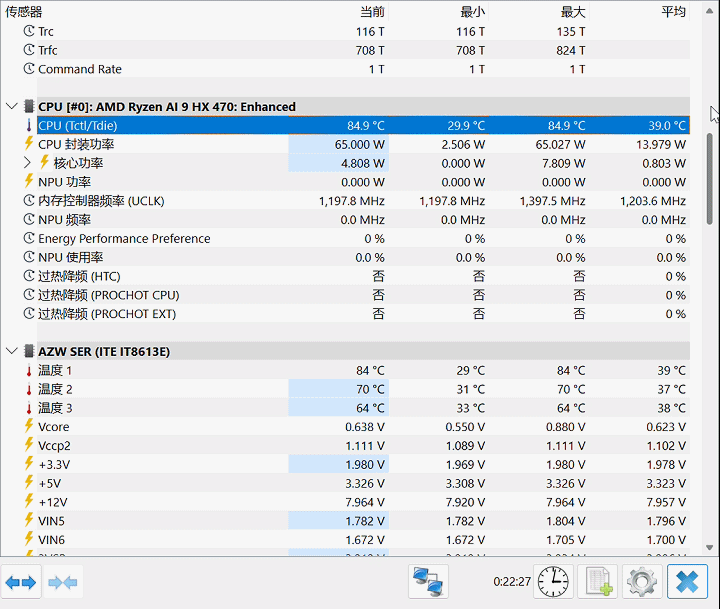在游戏负载下,处理器的温度会升至80℃,通过实测,甜甜圈FurMark 压力测试下,最高温度能到84.9℃,也就说零刻SER10Max的温度墙应该是设置在了85℃。