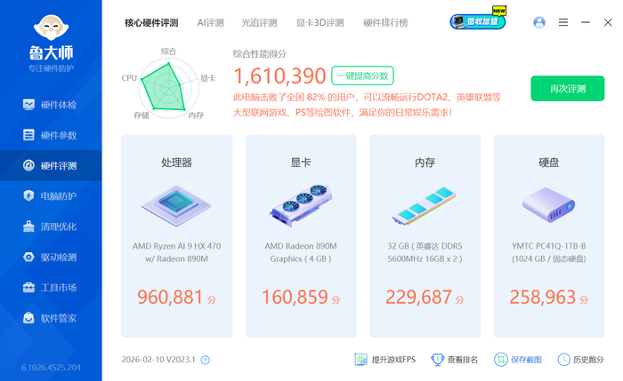 硬件配置方面,零刻SER10MAX采用AMD锐龙AI9旗舰级HX470处理器,2026年1月份才发布上市的最新处理器,是上一代HX370的迭代升级款,12核24线程,Radeon 890M GPU,其中NPU算力提升到了55TOPS,总AI算力86TOPS,内存支持DDR5 5600MT/s双通道最大可扩展至256GB,性能强悍,属于迷你主机里截至目前最顶级的性能配置了,加上万兆网口特别适合有NAS的视频创作者、极客、AI科技爱好者、商业办公以及企业教育运维行业等等。