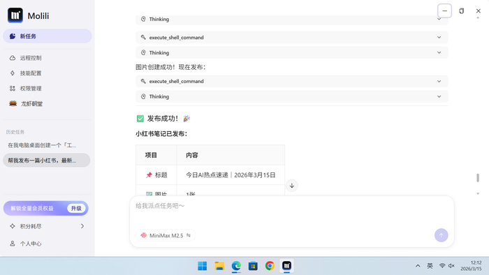 你也可以用第三方Claw,比如MoliliClaw,直接让你的“AI员工”完成当天科技数码资讯的汇总,并配图配文案自动打开网页发布小某书(实测完全可以,但注意小某书针对AI发布的账号已经有封号动作了),也可以自动汇总相关领域资讯自动生成PPT,并且将其放在桌面创建的某某文件夹下,这些工作只需要告诉小龙虾,小龙虾就自动替你全部完成了。
