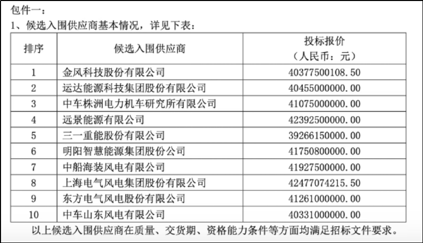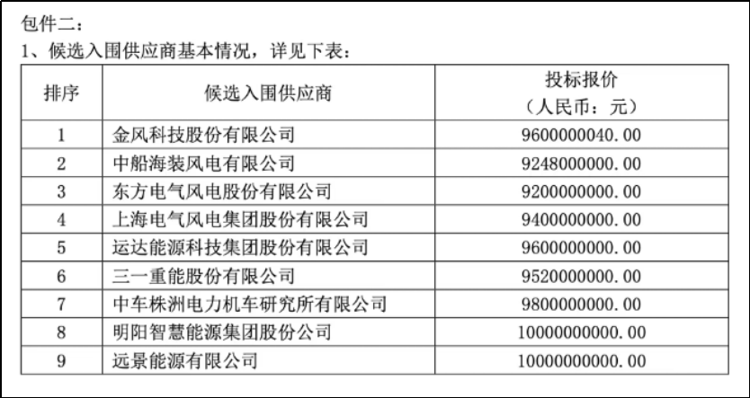 其中包件一共有10家整机商入围,分别是金风科技股份有限公司(简称“金风科技”,SZ:002202)、运达能源科技集团股份有限公司(简称“运达股份”,SZ:300772)、中车株洲电力机车研究所有限公司(以下简称“中车株洲所”)、远景能源有限公司(以下简称“远景能源”)、三一重能股份有限公司(简称“三一重能”,SH:688349)、明阳智慧能源集团股份公司(简称“明阳智能”,SH:601615)、中船海装风电有限公司(简称“中船海装”)、上海电气风电集团股份有限公司(简称“电气风电”,SH:688660)、东方电气风电股份有限公司(以下简称“东方风电”)、中车山东风电有限公司(简称“中车山东风电”)。其中,最高报价424.77亿元,投标单位为电气风电;最低报价392.66亿元,投标单位为三一重能。单价区间为1266.65—1370.23元/千瓦。