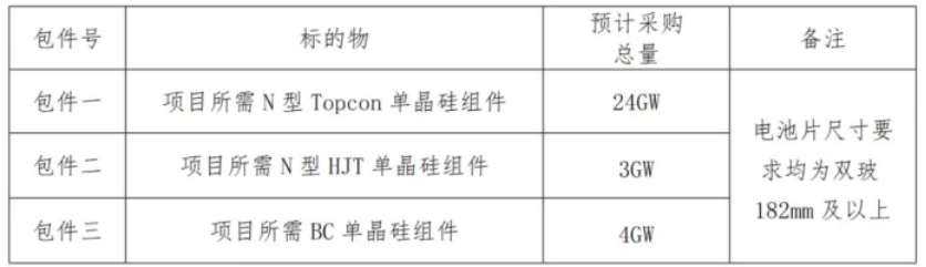 此前招标公告显示,该采购项目共分为三个包段,其中,包件一预计采购TOPCon组件24GW,包件二预计采购HJT组件3GW,包件三预计采购BC组件4GW,三个包件尺寸要求均为双玻182mm及以上。