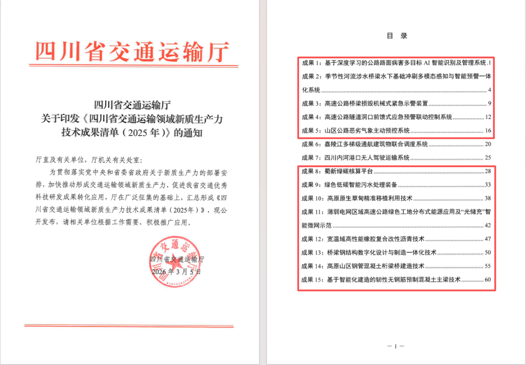 近日,四川省交通运输厅正式印发《四川省交通运输领域新质生产力技术成果清单(2025年)》,蜀道集团旗下多家公司牵头研发的13项技术成果入榜,全面覆盖智能监测、应急安全、绿色低碳、能源融合、生态保护、高性能建材等交通全链条核心领域,以全方位的技术突破与创新成果,为四川交通新质生产力培育注入蜀道科创动能,尽显行业领军企业的技术攻坚与创新引领硬实力。