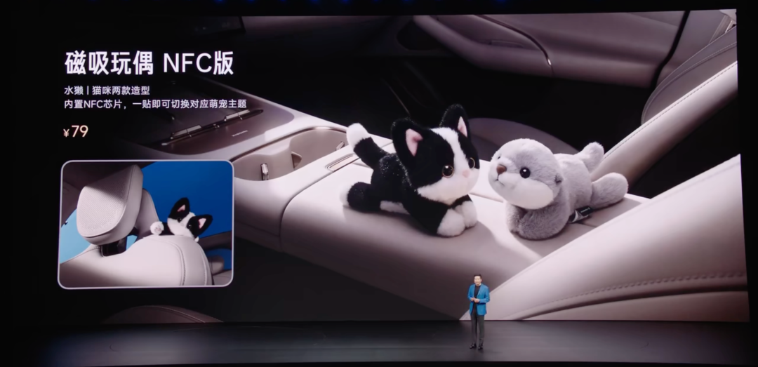“新一代SU7,新增全车9处磁吸点位,还为大家准备了一个小惊喜:磁吸玩偶NFC版。内置NFC芯片,一贴即可切换车机萌宠主题。”