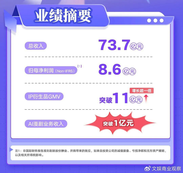 也就是说,在线业务之所以能重回主位,并非自身变强,而是版权运营及其他业务太弱。即便是被阅文单拎出来,与总收入、归母净利润一同列入业绩摘要的IP衍生品与AI漫剧,也都无法有力对冲悲观。