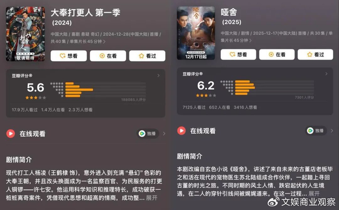一方面,新丽传媒在过去一年的低迷,并不仅仅是播出项目数量锐减所致,更与其在爆款输出上的稳定性失衡密切相关。其中被戏称为“爆了又没爆”的《大奉打更人》、“播了又没播”的《哑舍》,甚至让阅文的男频IP改编故事一度陷入了极为尴尬的境地。