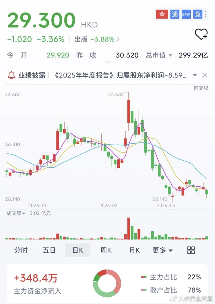 2月11日收盘,阅文股价从上一日的43.58港元/股跌至40.08港元/股,后又一路震荡下行,截至2025年报正式发布前一日,已跌至30.16港元/股。而在年报发布当第二天,阅文股价收盘下滑3.36%,至29.3港元/股。