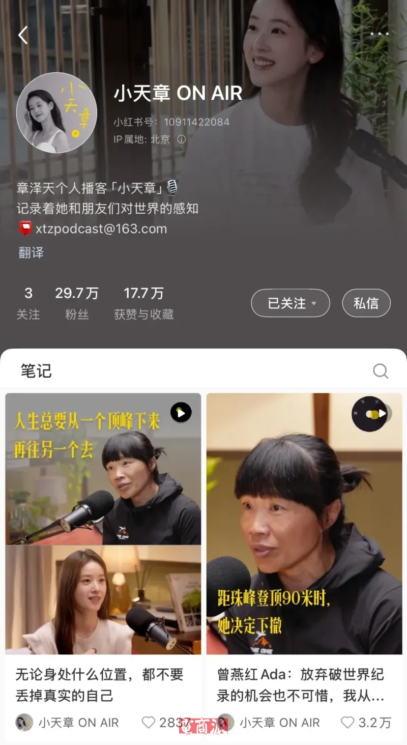 除了投资和时尚领域,章泽天还尝试跨界播客赛道,用更贴近大众的方式表达自我,打造个人内容IP。