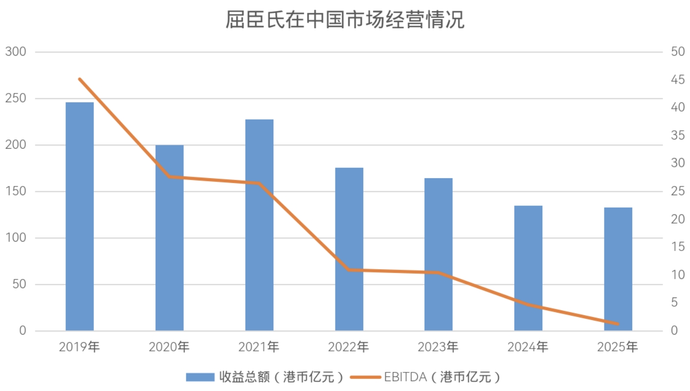 然而,中国市场却呈现疲软态势:营收132.65亿港元,同比下降1.8%;EBITDA仅1.22亿港元,同比骤降73.88%。作为唯一营收与盈利双降的市场,屈臣氏在中国正面临严峻挑战。