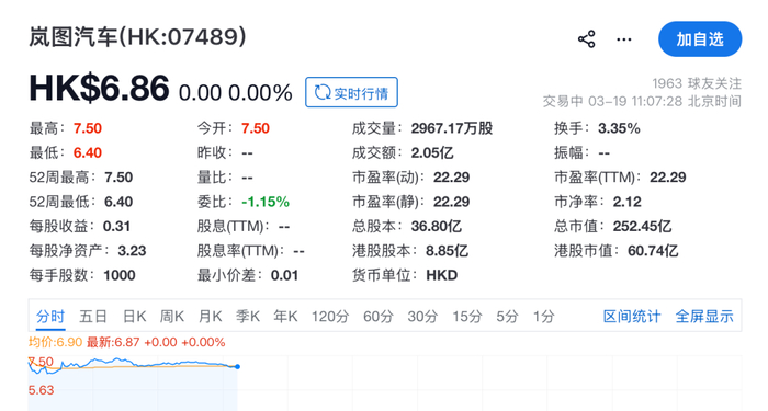 2026年3月19日,岚图汽车(7489.HK)将正式登陆港交所主板,成为首个独立赴港上市的央国企高端新能源汽车品牌。开盘价7.5港币/股,截止写稿时间总市值达252亿