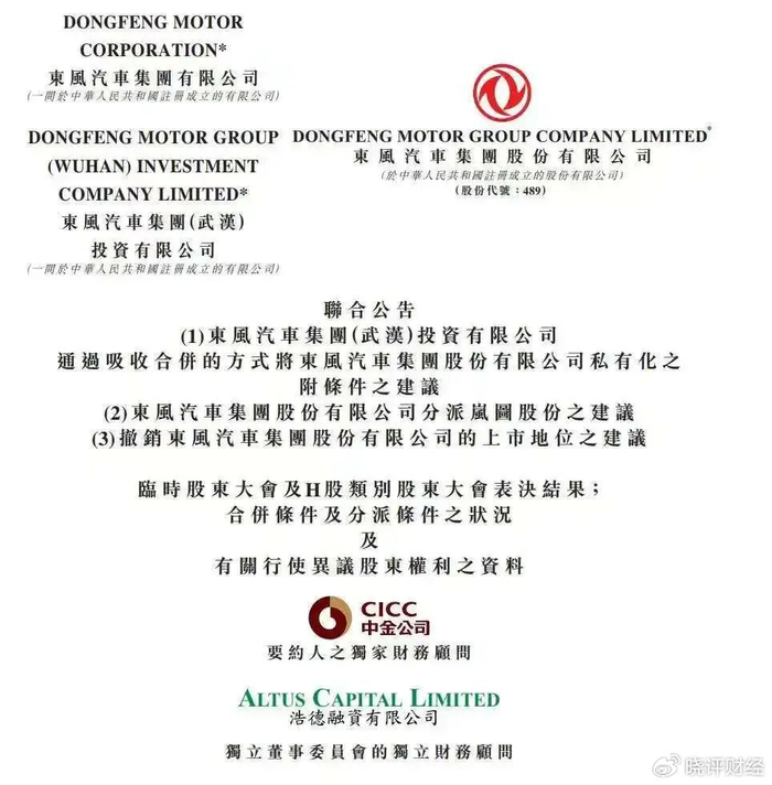 2025年8月,东风集团正式启动H股私有化,为中小股东提供每股6.68港元的现金对价,相关议案2026年3月在股东大会高票通过,将于当月18日正式从港交所退市,最终实现100%国有控股。