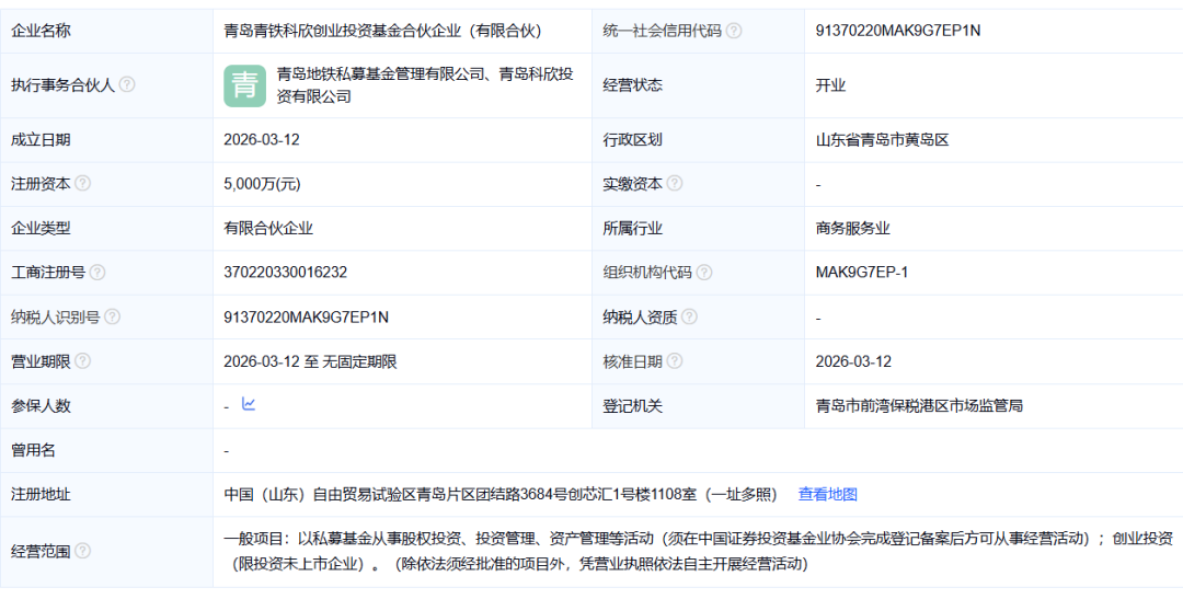 近日,青岛青铁科欣创业投资基金合伙企业(有限合伙)(下称“青铁科欣基金”)在山东自贸区青岛片区完成注册。