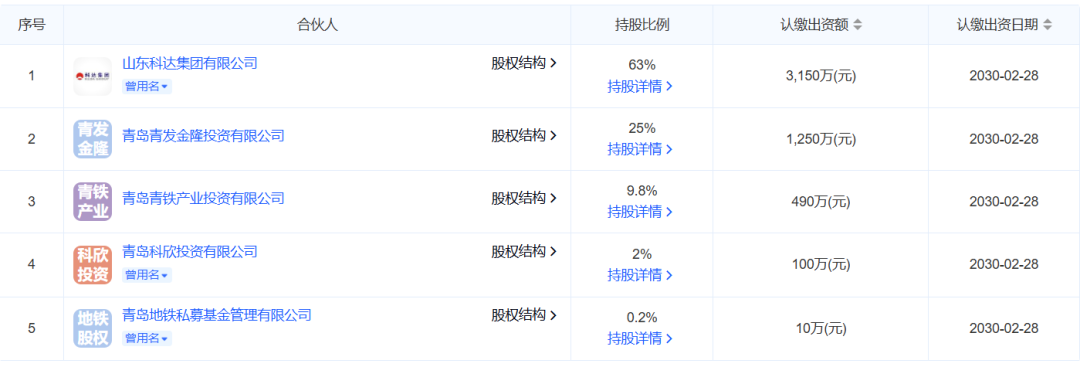 作为第一大股东的山东科达集团有限公司(下称“科达集团”)出资占比63%,是基金的主要出资方;青岛青发金隆投资有限公司(下称“青发金隆”)、青岛青铁产业投资有限公司(下称“青铁产投”)两家国资平台合计持股34.8%;青岛地铁私募基金管理有限公司(下称“地铁基金”)与青岛科欣投资有限公司共同担任执行事务合伙人。