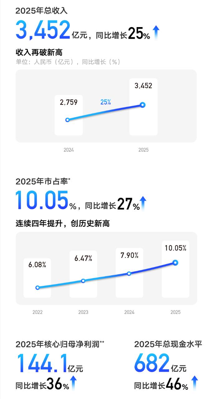 经营层面,吉利汽车全年实现营业收入3452亿元,同比增长25%;核心归母净利润144.1亿元,同比增长36%,核心利润增速持续快于收入增长。
