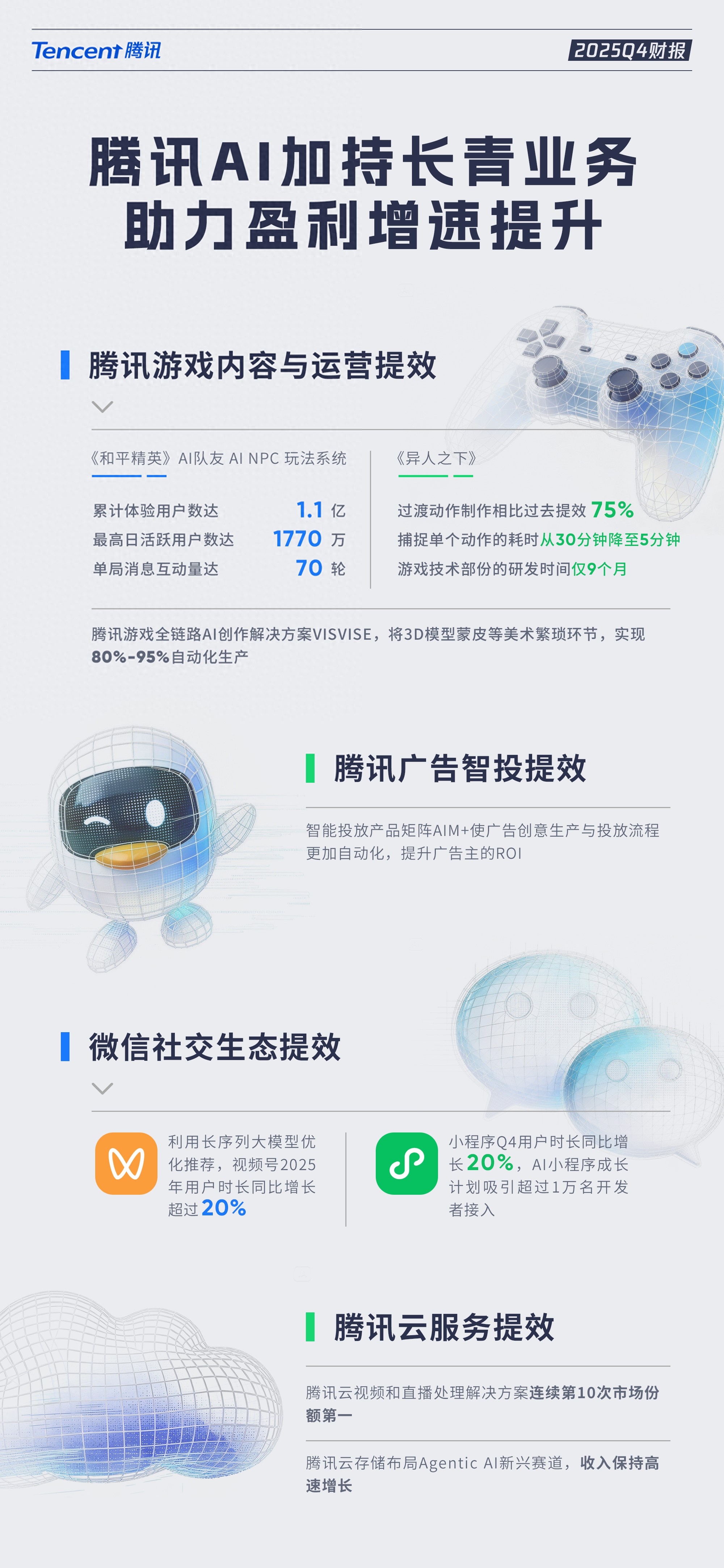 即便在最核心的游戏大本营,AI的渗透也已深至骨髓。全年游戏业务收入达2416亿元,同比增长22%。其中,本土市场游戏收入同比增长18%至1642亿元,国际市场游戏收入突破100亿美元大关,同比增长33%,创历史新高。在今年GDC上,腾讯亮出了AI在美术生成、NPC逻辑和测试环节的大规模实战。以《和平精英》为例,其游戏内AI NPC玩法的累计体验用户数已达1.1亿,最高日活跃用户数达1770万——一个游戏内的AI玩法,日活就顶一个中型App。体验AI NPC的玩家一局有70轮消息互动,且麦克风开启率接近75%。玩家跟AI说话这么勤,说明AI不是噱头,而是真的在创造留存和时长。