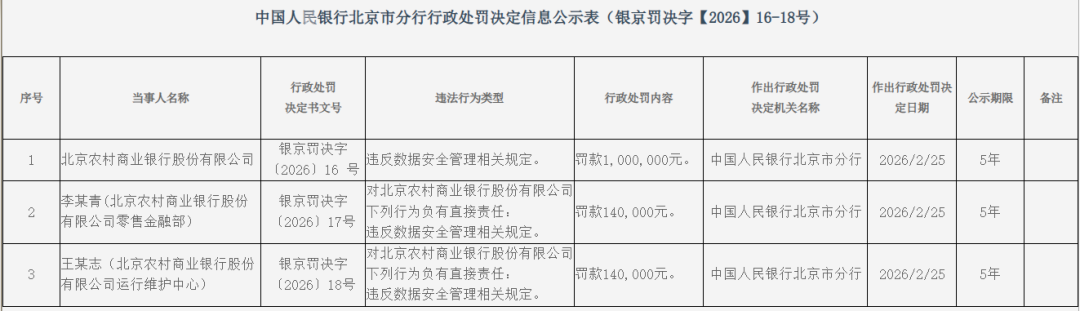 2月25日,中国人民银行北京市分行披露的罚单显示,北京农商行被罚款100万元,源于违反数据安全管理相关规定。同时,该行零售金融部李某青、运行维护中心王某志负直接责任,均被罚款14万元。