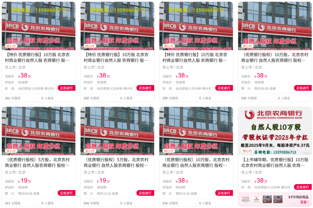 根据证券时报此前报道,在阿里资产拍卖平台上,3月初曾有一笔10万股北京农商行股权,起拍价仅为188元。截至3月8日,这笔股权拍卖已有21人报名参与,并吸引超4700次围观。