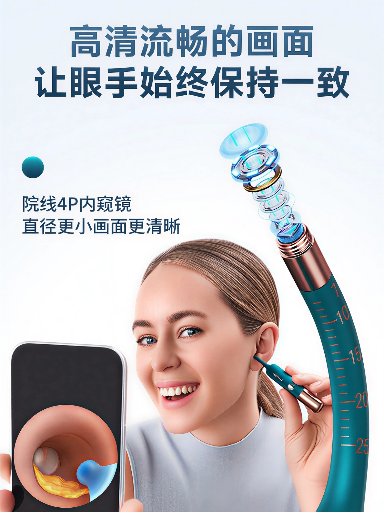 镜管采用3.6mm超细蛇形软管设计,可自由弯折,贴合不同耳道结构,避免直戳硬捅伤害耳道。机身外层包裹亲肤硅胶材质,触感柔和,进一步提升了使用舒适度和安全性。