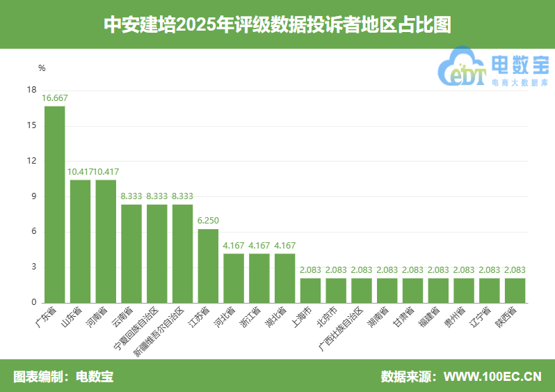 根据网经社旗下电商大数据库“电数宝”显示,2025年投诉“中安建培”的用户主要集中地区为广东省(16.667%)、山东省(10.417%)、河南省(10.417%),其于分别为:云南省、宁夏回族自治区、新疆维吾尔自治区、江苏省、河北省、浙江省、湖北省、上海市、北京市、广西壮族自治区、湖南省、甘肃省、福建省、贵州省、辽宁省、陕西省。