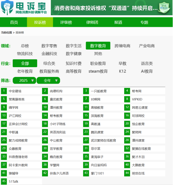 根据“电诉宝”2025年受理的中国数字教育领域用户(包括消费者投诉及商家投诉)有效投诉显示,入选投诉榜的依次为:中安建培、尚德机构、一只船教育、帮考网、常青藤爸爸、赛优教育、对啊网、VIPKID、嗨学网、潭州教育、高顿教育、网易云课堂、沪江网校、帮考教育、深海教育、环球网校、正保会计网校、小叶子陪练、高教通、恒企教育、中职通、英语流利说、腾讯课堂、聚师网、聚力成师教育、中公教育、武汉聚师在线教育、潭州课堂、众趣教育、芸学教育、菲尔莱、聚狮在线教育、抖音查理老师、晚舟教育、麦淘亲子、聚才木羽、阿卡索外教网、学慧网、向日葵妈妈、大鹏教育、猿辅导、伴鱼少儿英语、掌门1对1、明世在线、51Talk等。其中,“中安建培”排名第1位。