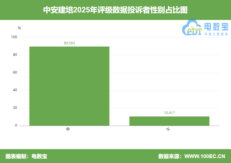 根据网经社旗下电商大数据库“电数宝”显示,投诉“中安建培”男性用户投诉比例为89.583%,女性用户投诉比例为10.417%。
