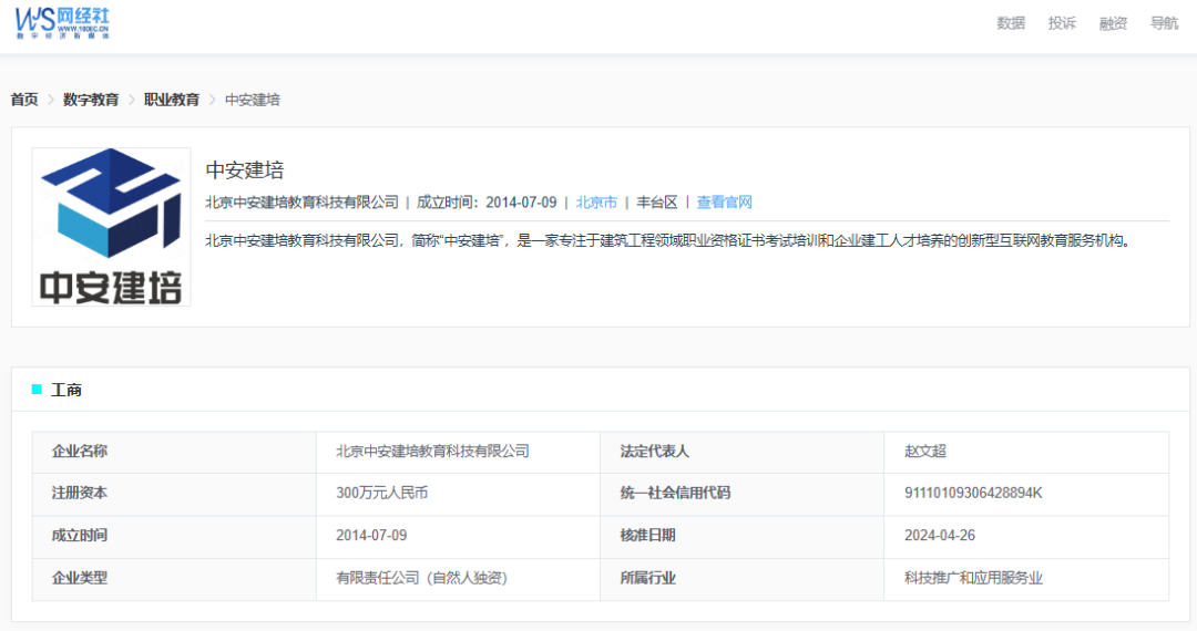 据网经社企业库(COP.100EC.CN)显示,北京中安建培教育科技有限公司,简称“中安建培”,成立于2014年7月9日,法定代表人为赵文超。自称是一家专注于建筑工程领域职业资格证书考试培训和企业建工人才培养的创新型互联网教育服务机构。