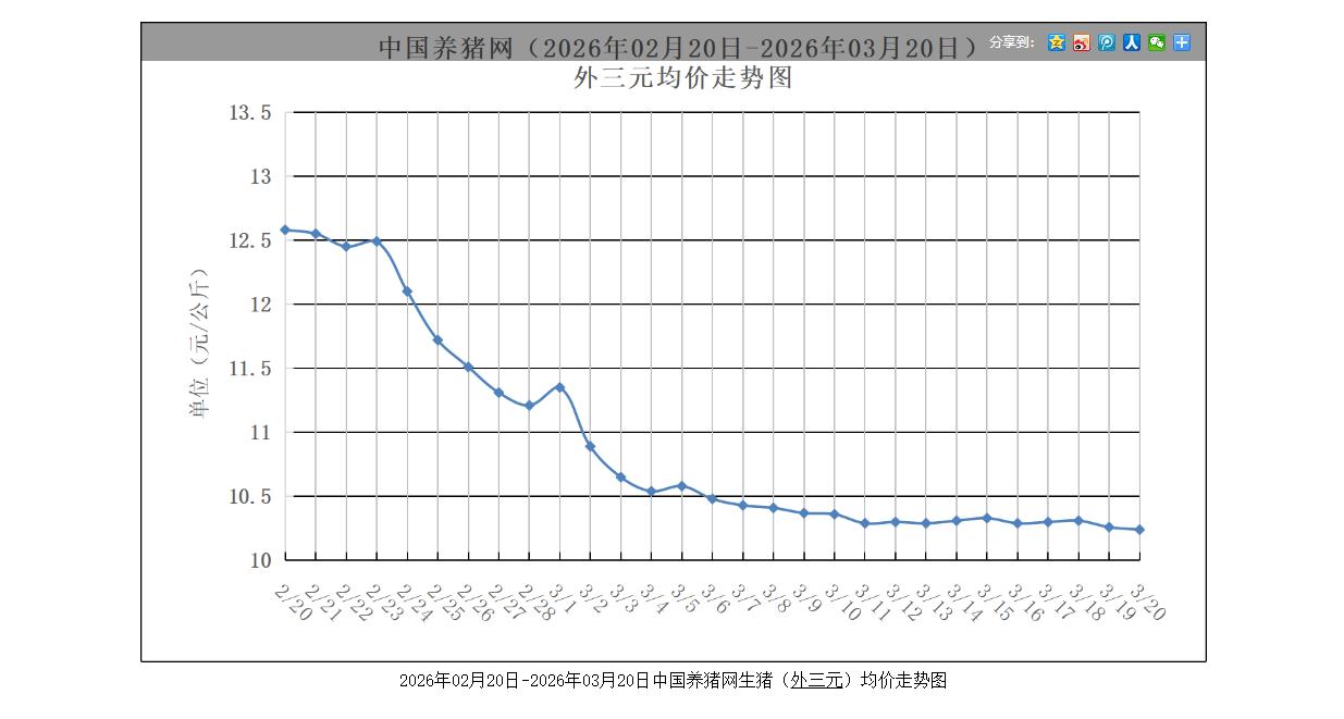 根据中国养猪网3月20日的外三元生猪报价,当日全国猪价延续弱势下跌态势。网站猪评显示,行业已陷入深度亏损,自繁自养模式下头均亏损接近190元,外购仔猪养殖头均亏损超过310元。