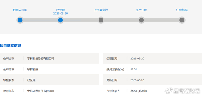 3月20日晚,上交所官网公告显示,宇树科技的科创板IPO项目获得交易所受理,保荐机构为中信证券,拟融资42.02亿元。