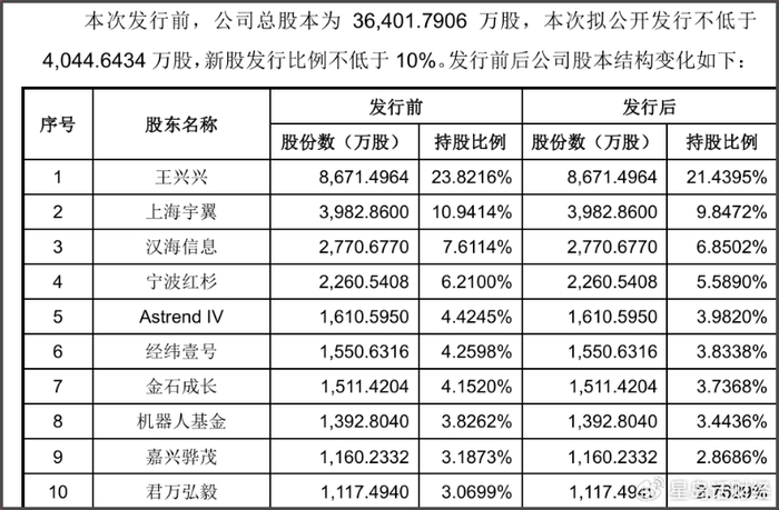 据了解,宇树本次公开发行新股不低于40,446,434股,占发行后总股本的比例不低于10%,拟募集资金42.02亿元。