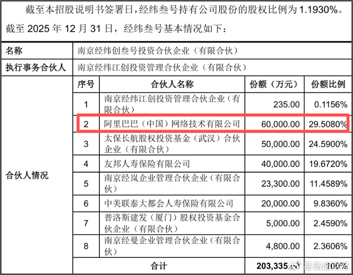而在持股1.1930%的经纬叁号中,也出现阿里巴巴的身影,阿里持股经纬叁号29.5%。