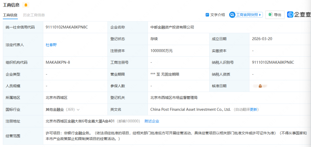 换言之,时隔约5个月后,中邮投资正式获准开业。记者查阅企查查数据,目前,中邮投资的法定代表人为杜春野,该公司于2026年3月20日成立,经营范围包含非银行金融业务。