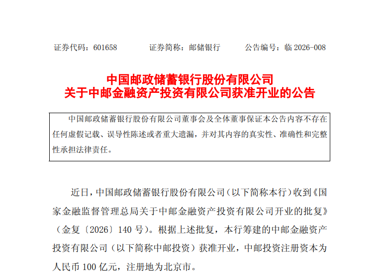 3月20日,邮储银行公告称,该行收到国家金融监督管理总局批复,该行筹建的中邮金融资产投资有限公司(以下简称中邮投资)获准开业,注册资本为100亿元,注册地在北京市。