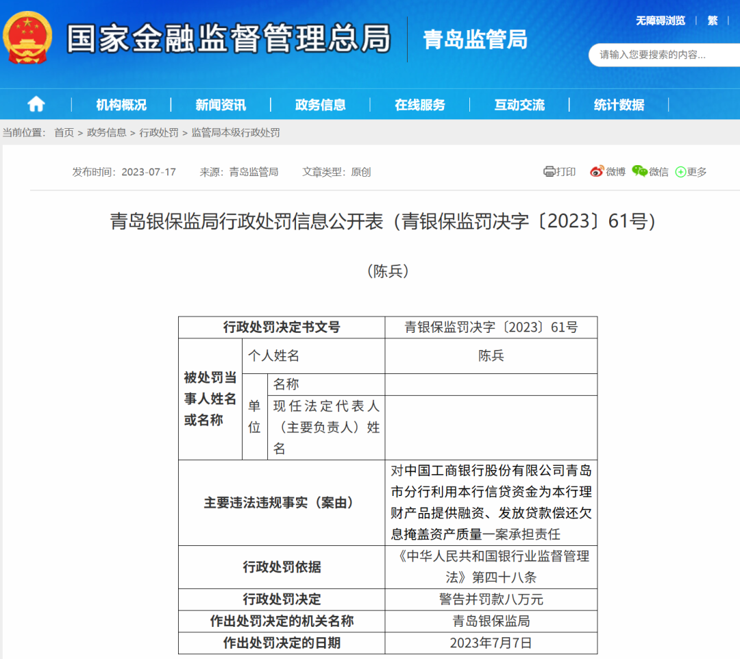 值得一提的是,2023年7月,国家金融监管总局公布的行政处罚信息显示,工商银行青岛市分行因利用本行信贷资金为本行理财产品提供融资、发放贷款偿还欠息掩盖资产质量、业务存续期管理不到位导致贷款或理财资金被挪用,被处罚款110万元。