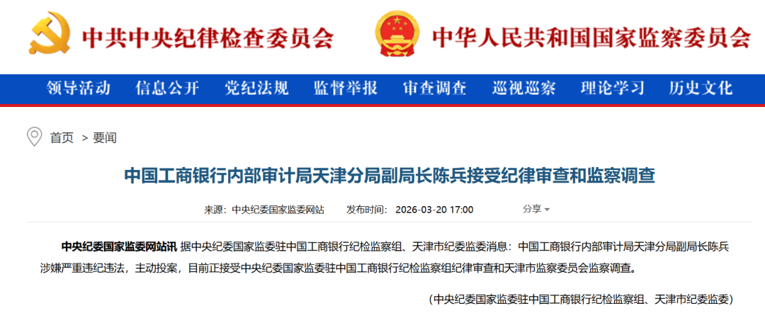 3月20日,中央纪委国家监委官网通报:中国工商银行内部审计局天津分局副局长陈兵涉嫌严重违纪违法,主动投案,目前正接受中央纪委国家监委驻中国工商银行纪检监察组纪律审查和天津市监察委员会监察调查。