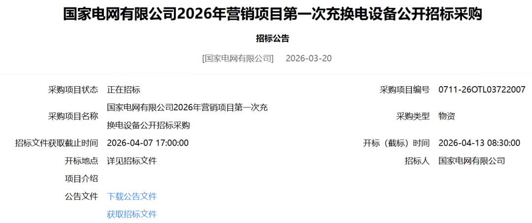 国家电网有限公司2026年营销项目第一次充换电设备公开招标采购招标公告
