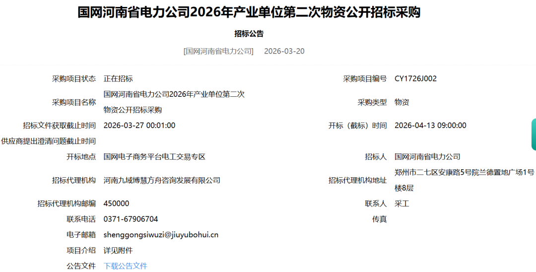 国网河南省电力公司2026年产业单位第二次物资公开招标采购招标公告