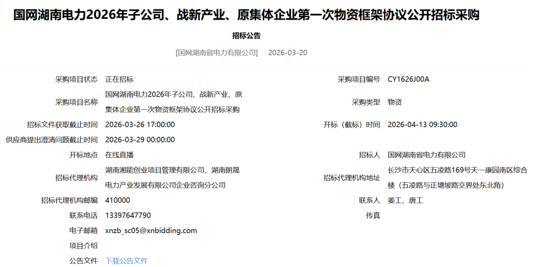 国网湖南电力2026年子公司、战新产业、原集体企业第一次物资框架协议公开招标采购招标公告